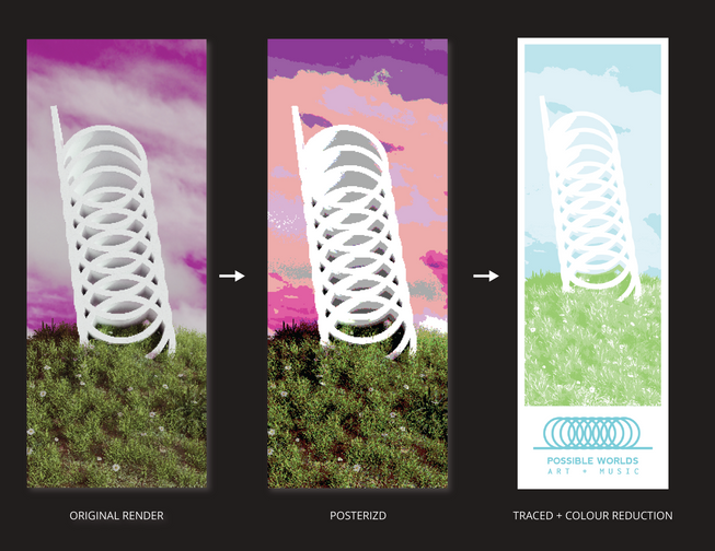 This was the first design project I had the fortune of working on. I was tasked with designing a series of bookmarks for Possible Worlds to distribute at events and also sell at their storefront. I had very few creative limitations, other than to ensure the bookmarks were appropriately branded and could be printed correctly on a risograph (meaning I would be limited to a maximum of two ink colours instead of a traditional CMYK prints). This presented a particularly novel creative challenge that I willingly embraced. Focusing on the organization’s title “possible worlds”, I opted to design a series of vignettes that peered into possible worlds, alternate realities, and alternate dimensions, with surreal characteristics far outside of our known reality.