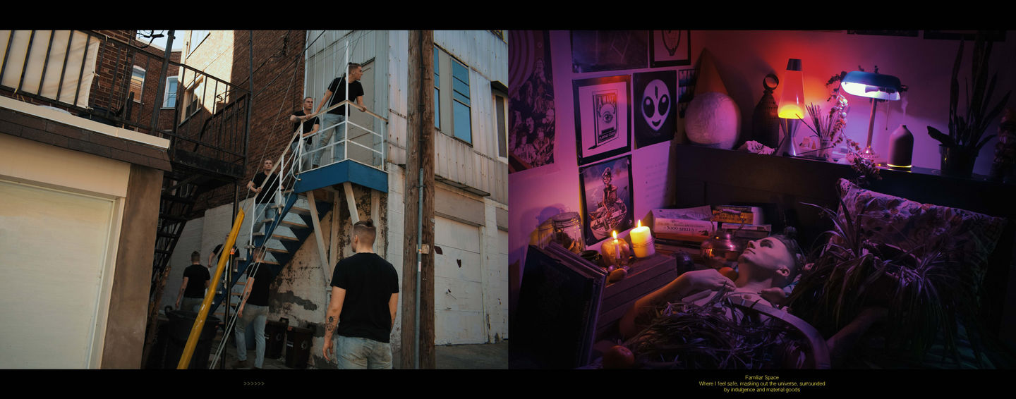 Starting with the idea of "performing liminality," the project became an adventure across various dimensions (1D to Non-Euclidean), and I reflected upon my experience and feelings in each of these spaces. As I situated myself in each dimension, I aimed to communicate the unique aspects of these spaces. For example, in 1D space, I juxtaposed myself with a tree to represent a singular point in a vast natural network. In 2D space, the metro symbolized a lack of autonomy of space, or being forced to share your space in unrealistic ways (think rush hour). Transitions between dimensional spaces were a bit more playful, and occurred in alleys behind Montreal apartments, throughout the city, acting as portals between the familiar and unfamiliar. I attempted to represent my disorientation in unfamiliar alley spaces through body duplications. The exploration reaches a climax in non-Euclidean space, symbolizing my fear of confronting an unknown reality, represented through distorted forms and collision with a car. The journey concludes in a deliberately contrasting familiar space, symbolizing our human habit to mask and transform spaces with material distractions. "Traversal" draws attention to overly-commercialized spaces and material obsession, and advocates for a more pluralistic understanding of space beyond the binary of familiar and unfamiliar.